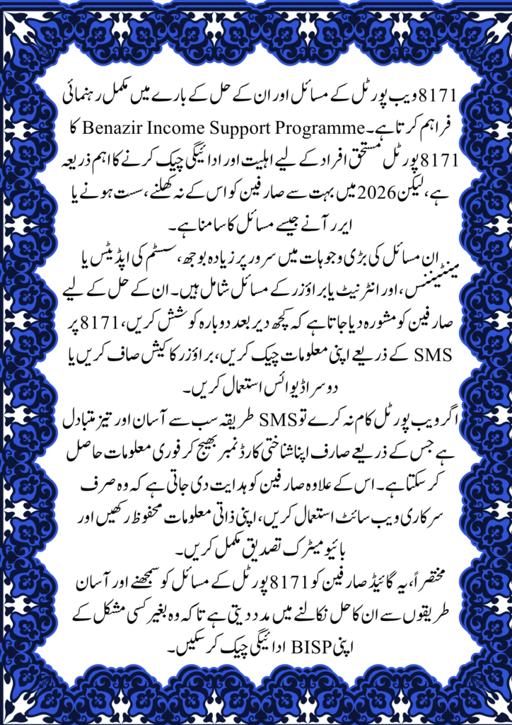 The 8171 web portal of the Benazir Income Support Programme is an important platform for checking eligibility and payment details. However, many users in 2026 are facing issues such as the portal not opening, errors, or slow loading.
