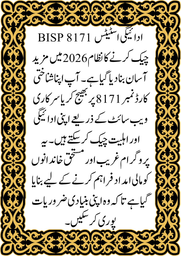 The BISP 8171 Payment Status Check 2026 system allows beneficiaries across Pakistan to quickly verify their financial assistance details. Managed by the Benazir Income Support Programme (BISP), this service ensures transparency and easy access for low-income families who depend on government support.